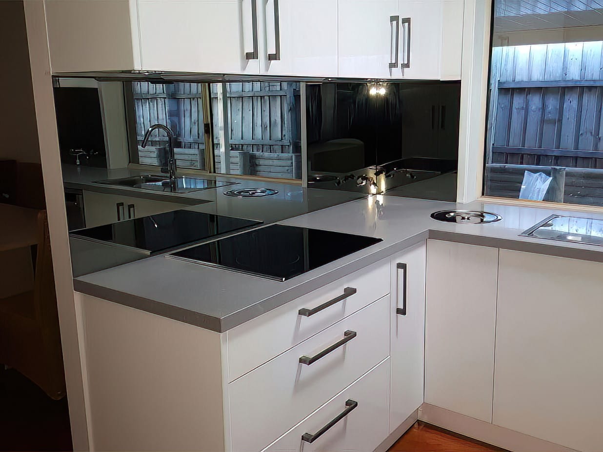 Splashbacks are made on 6mm glass and depending upon the placement may be toughened to form A-Grade Safety Glass. The toughening process is used mainly when the glass will be effected by heat, usually from a stovetop.